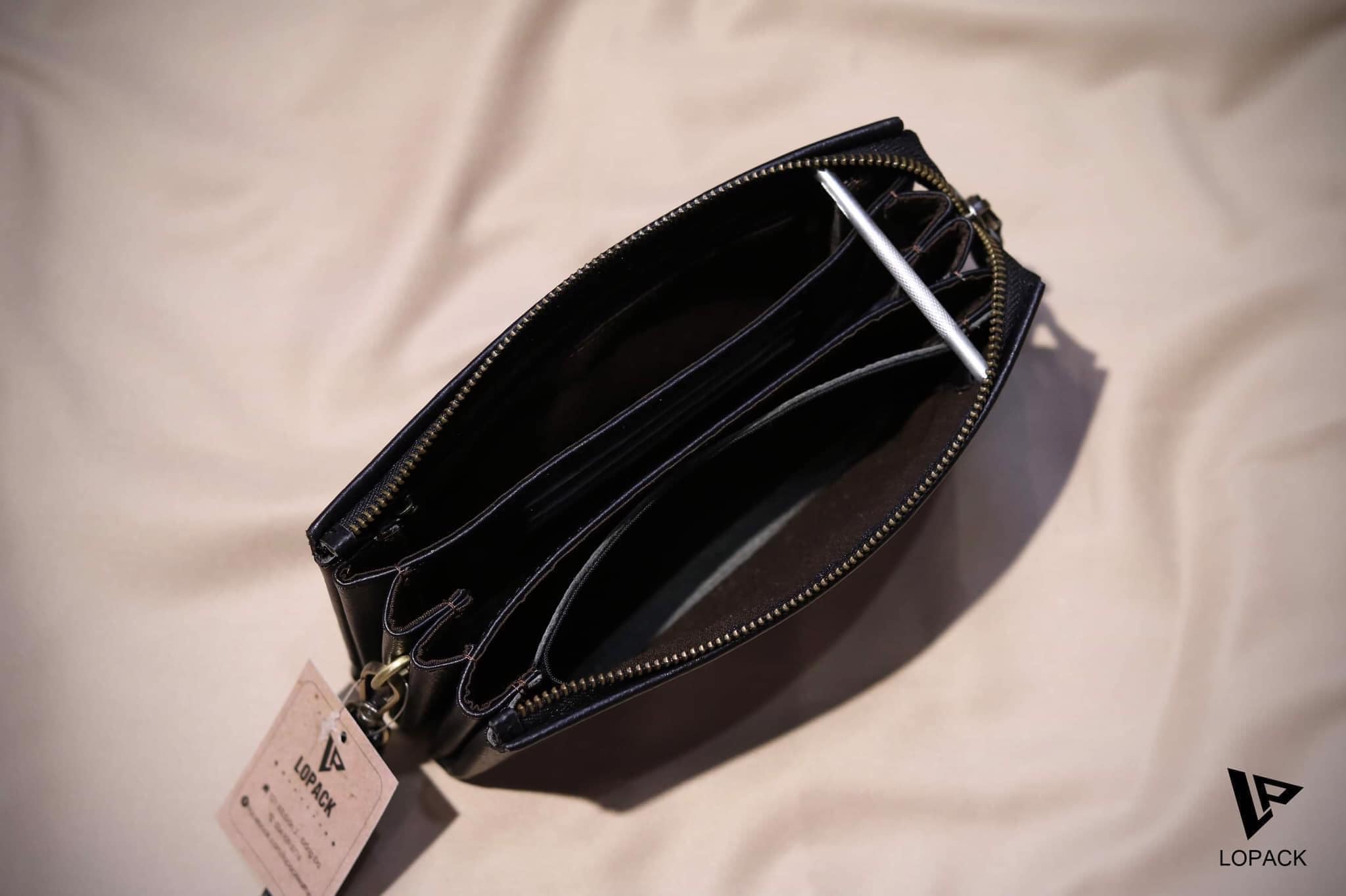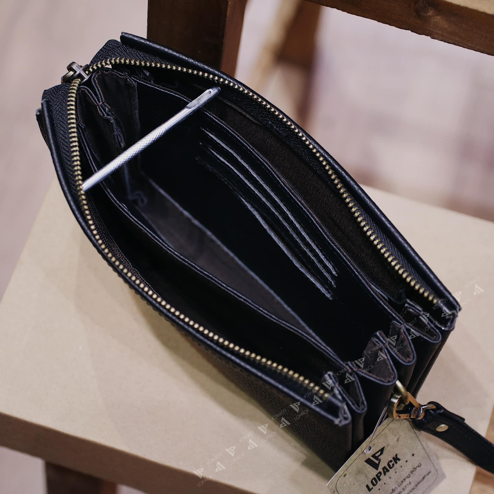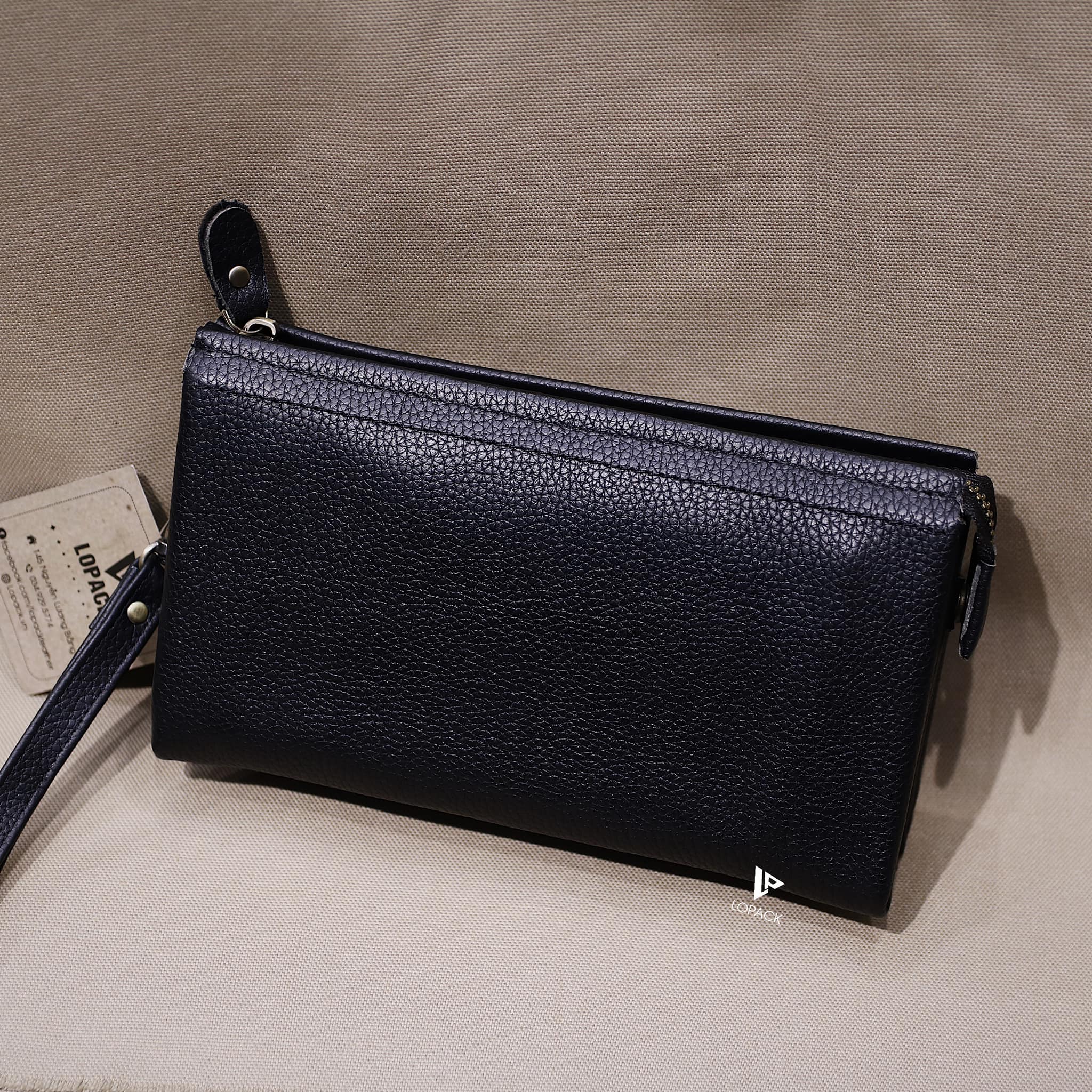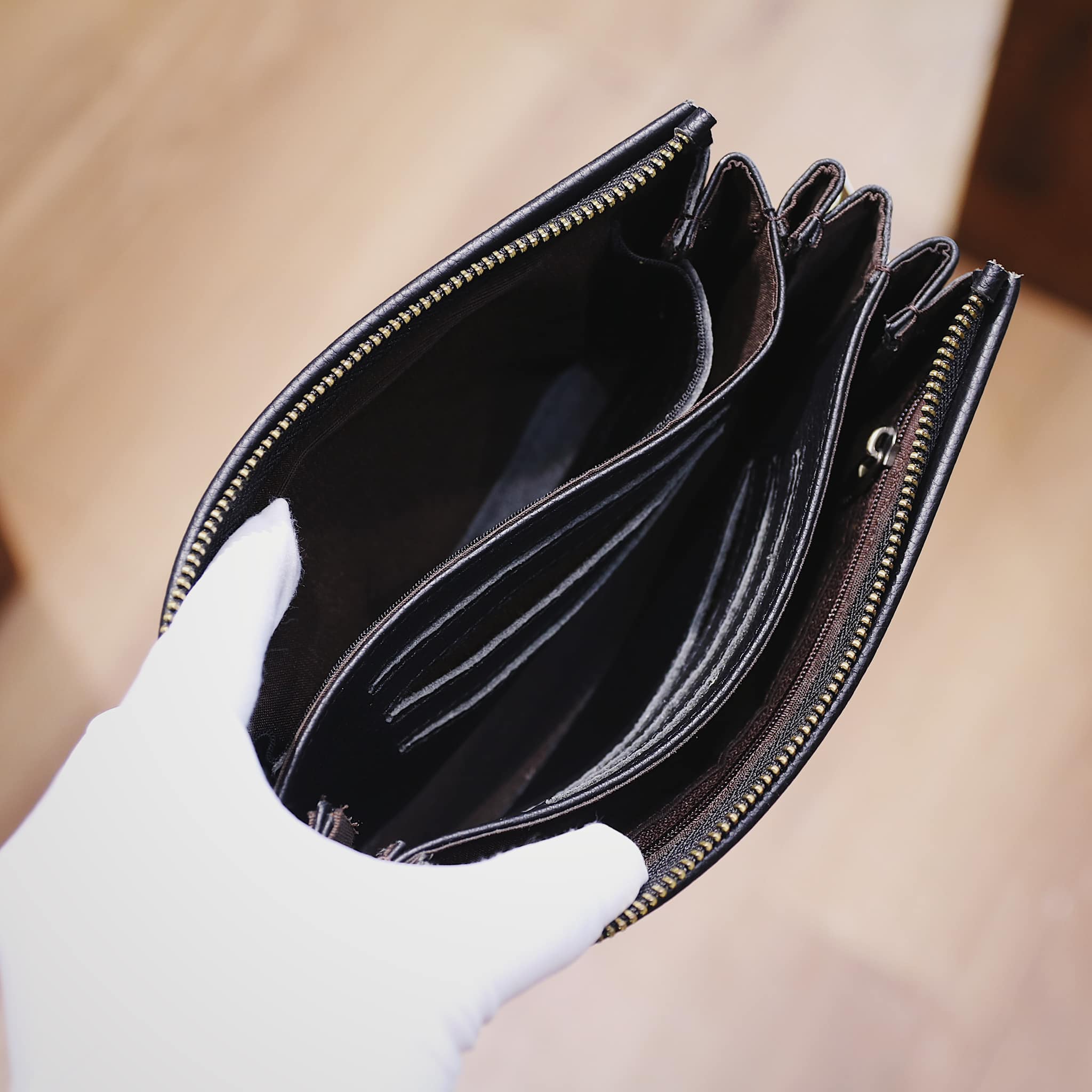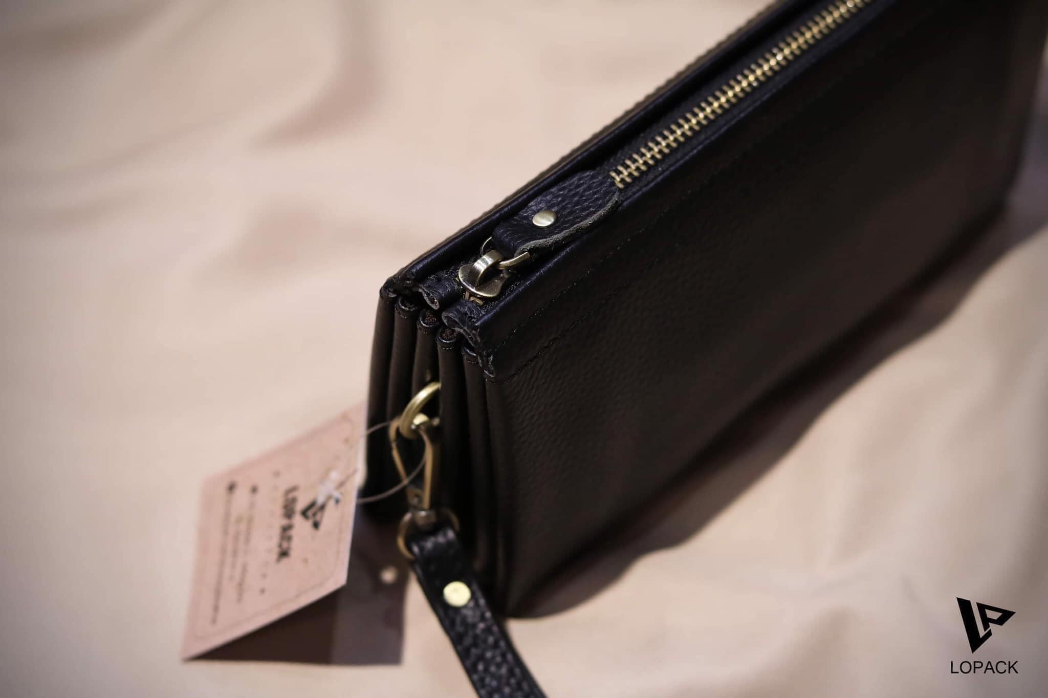 - Clutch chia nhiều ngăn đựng đồ, may phần đáy độc đáo.