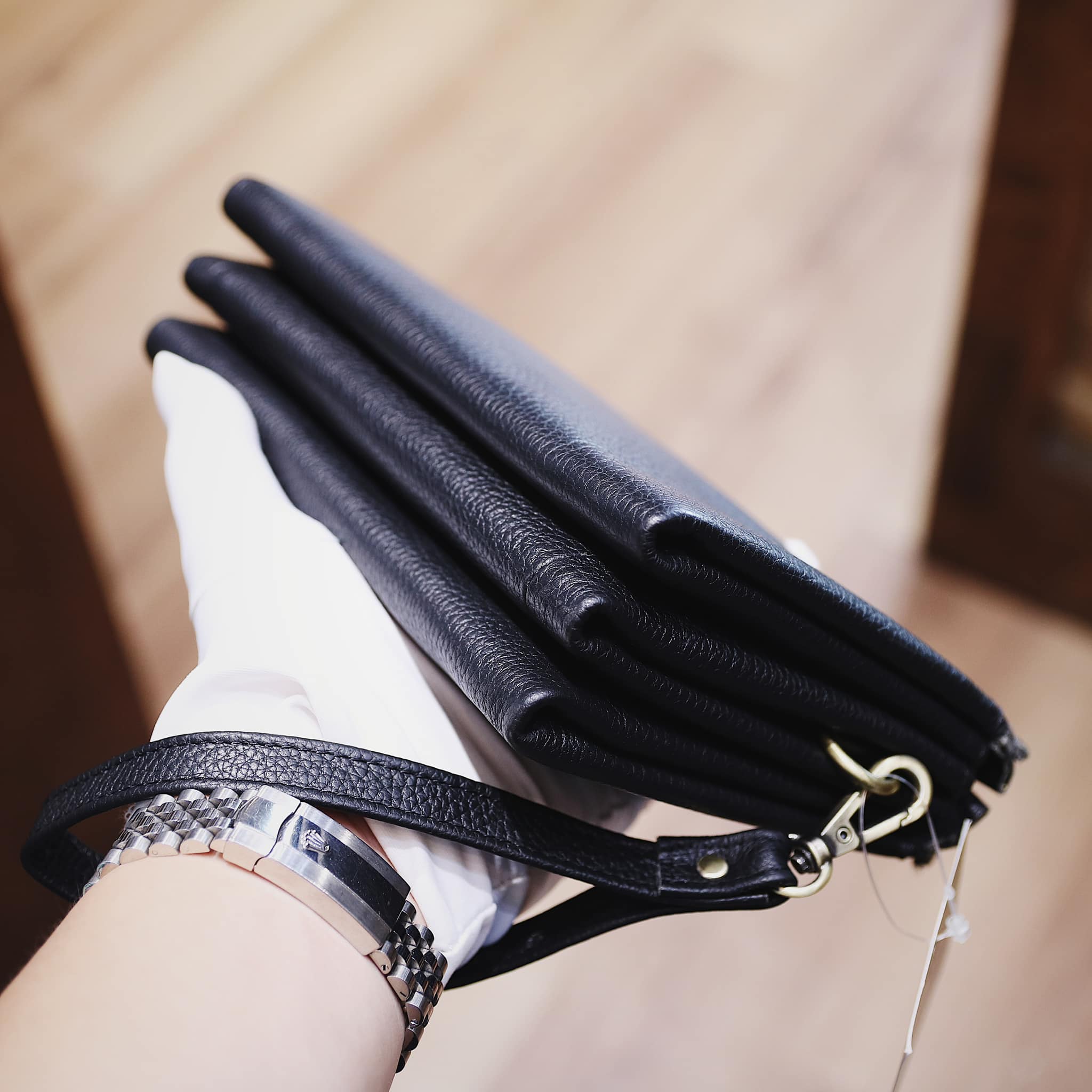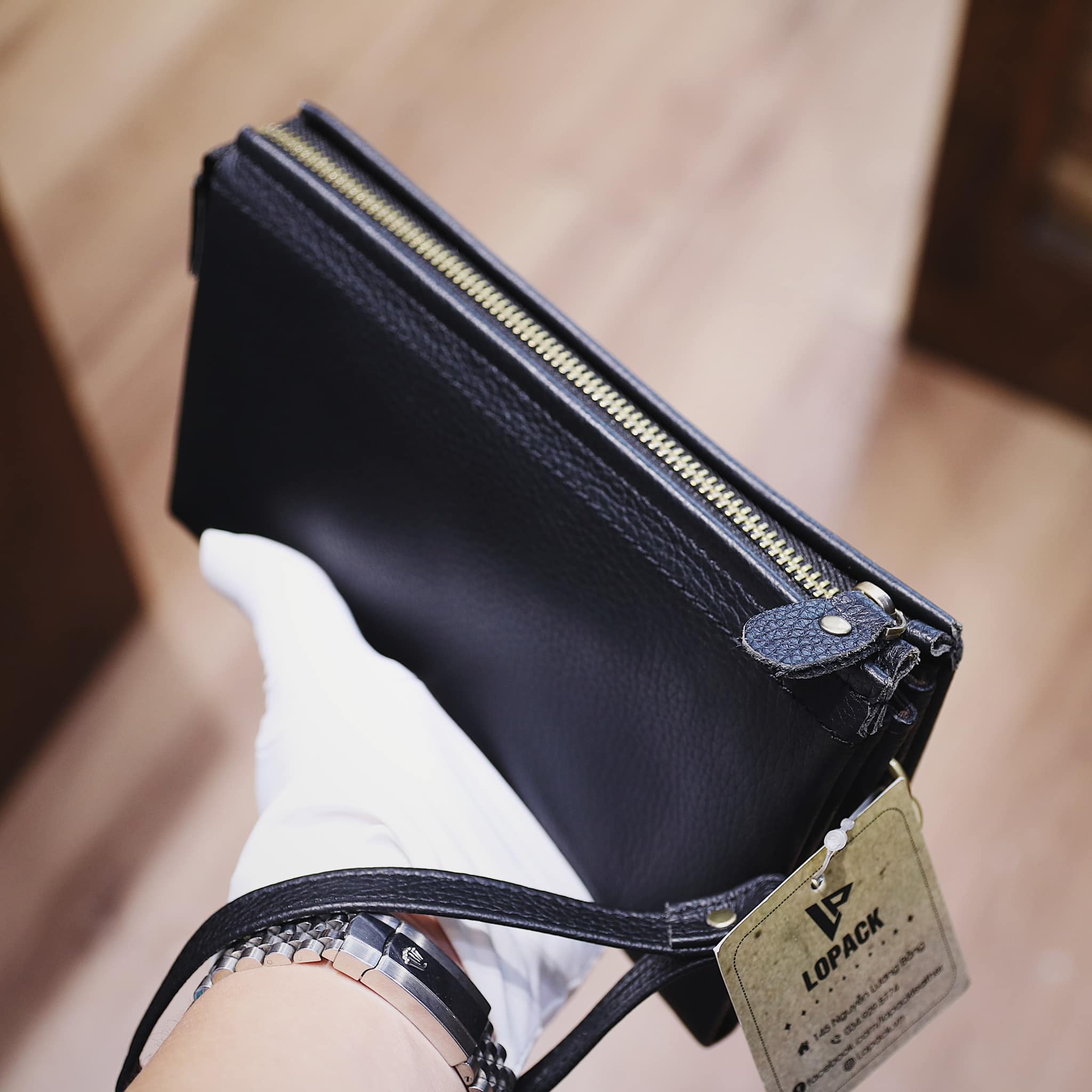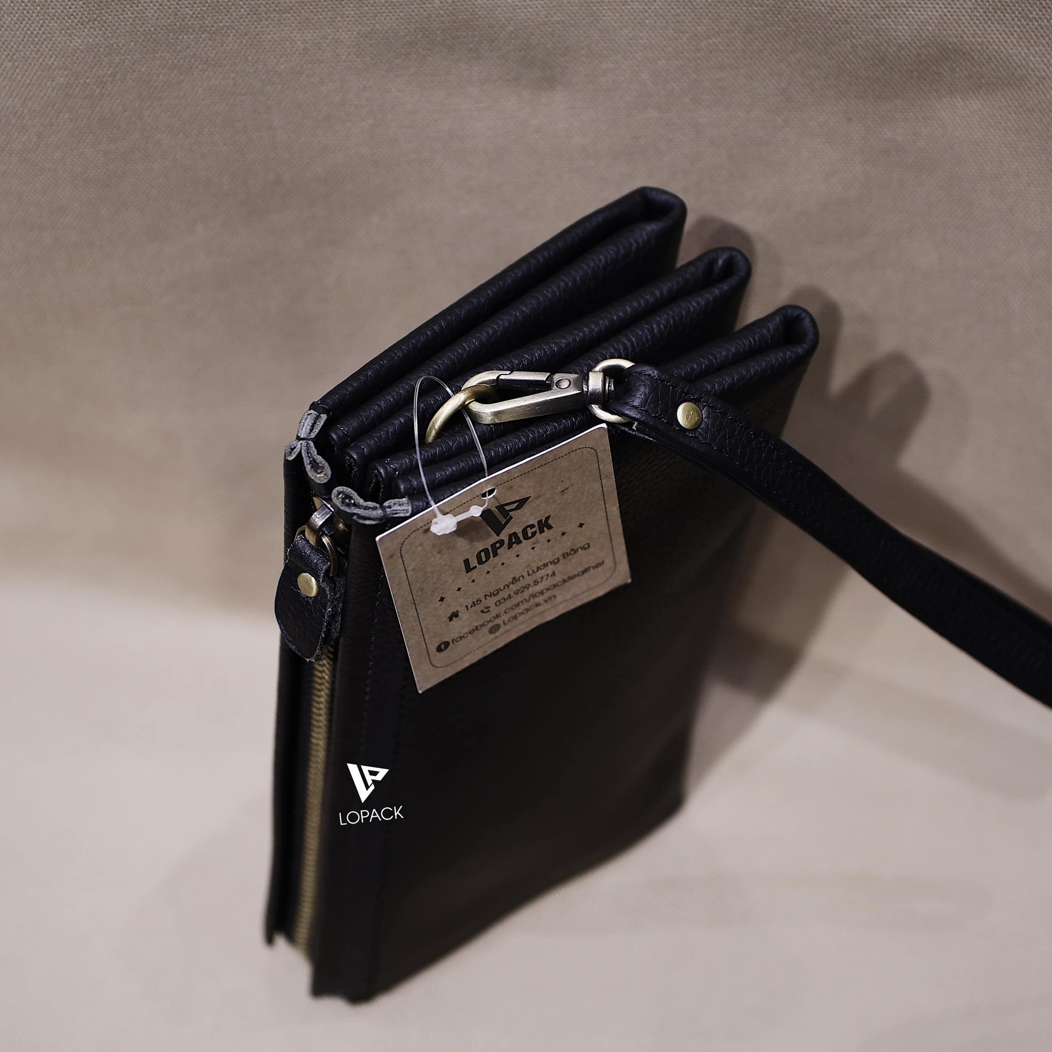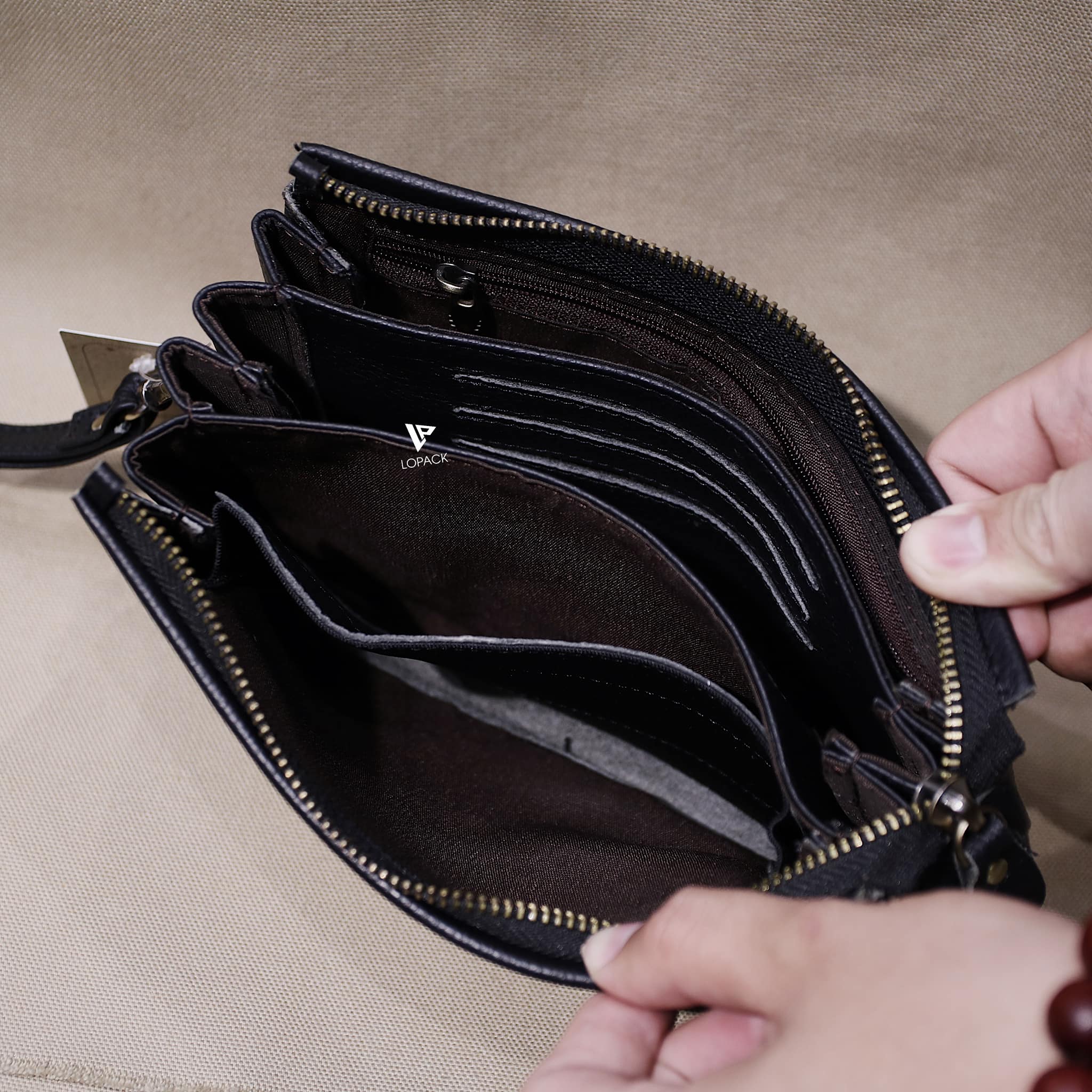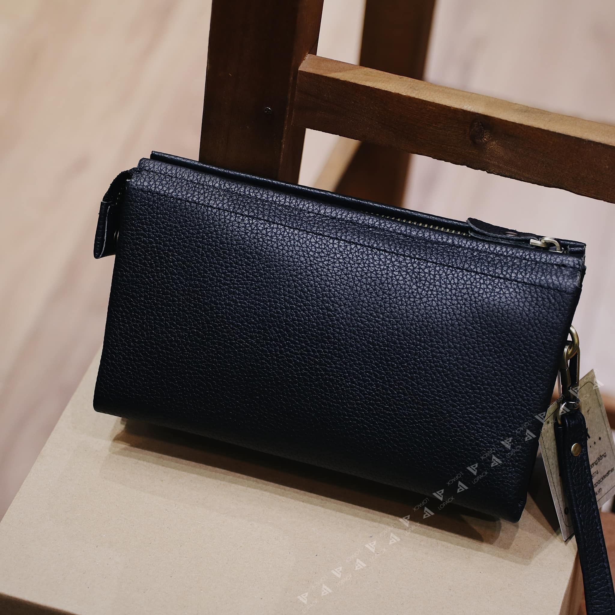 - Clutch chia nhiều ngăn đựng đồ, may phần đáy độc đáo.