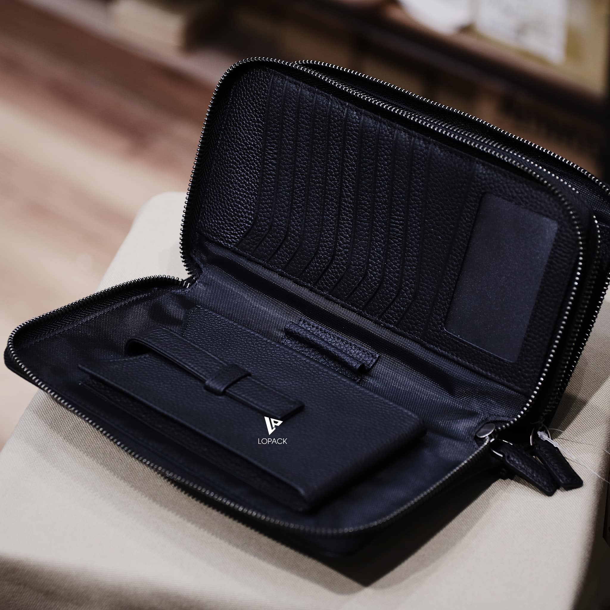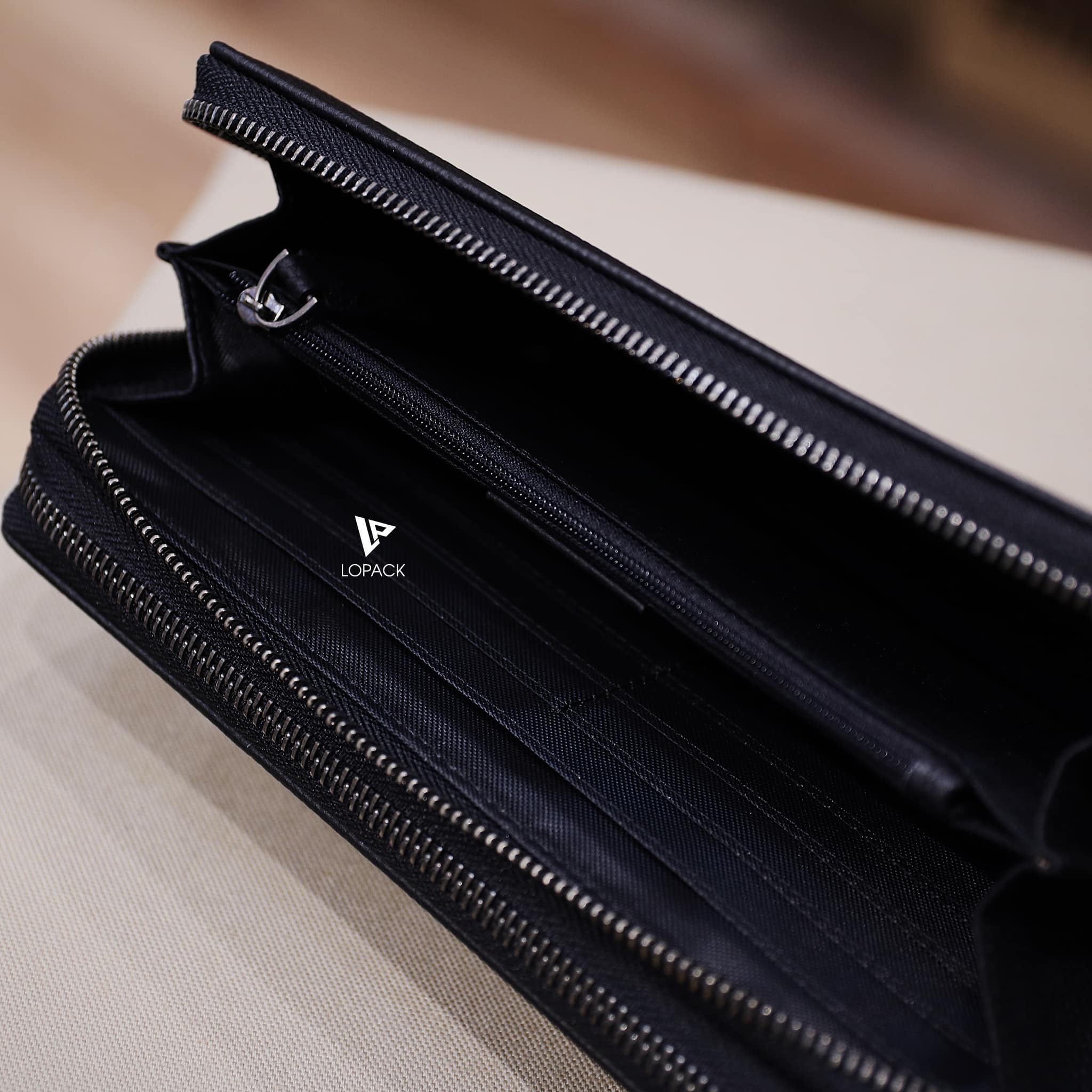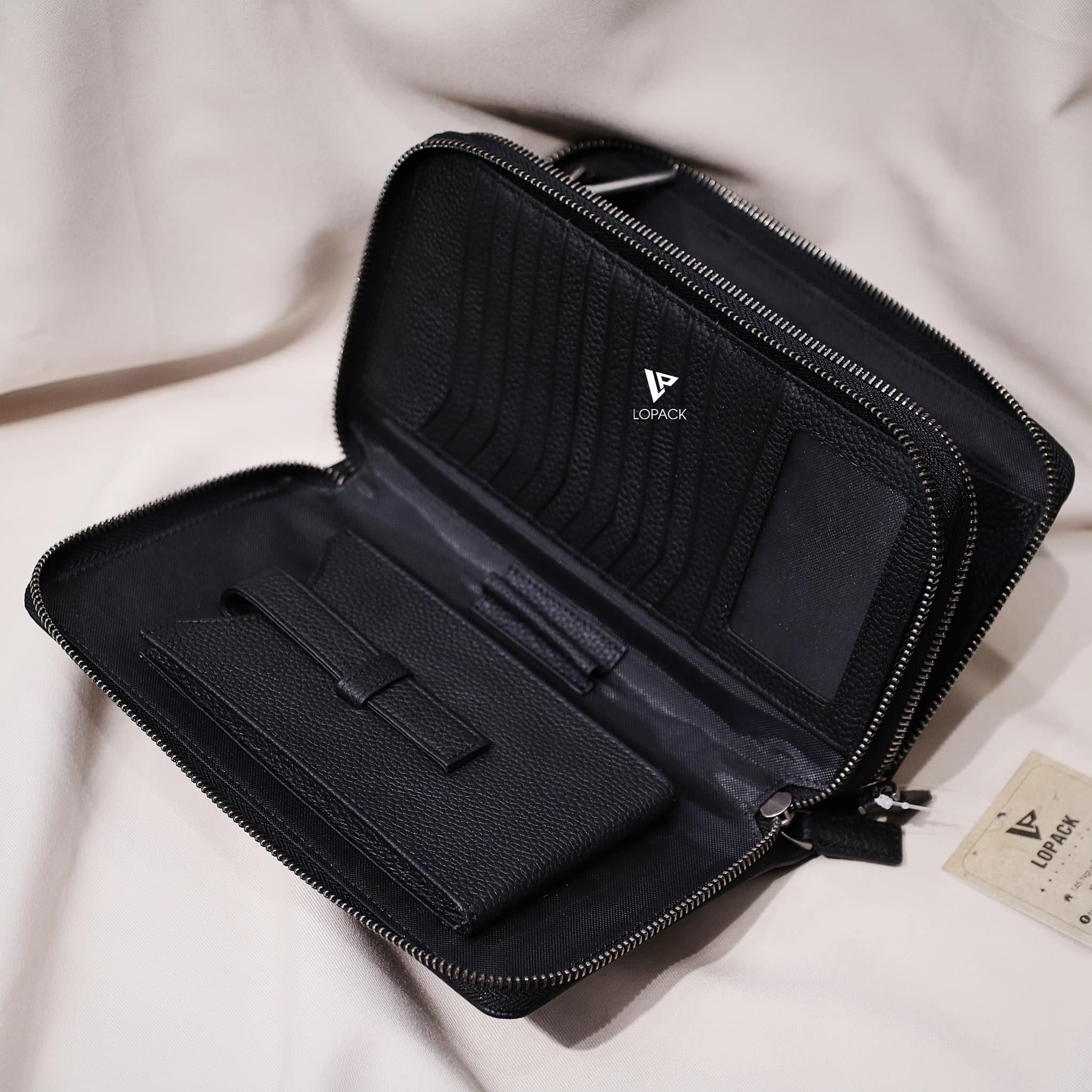 - Có quai xách ở gáy túi, mở ra bên trong có rất nhiều ngăn đựng thẻ, giấy tờ.