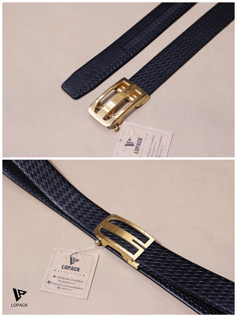 - Dây da đen trơn vân to khoẻ khoắn, khâu viền chắc chắn.
