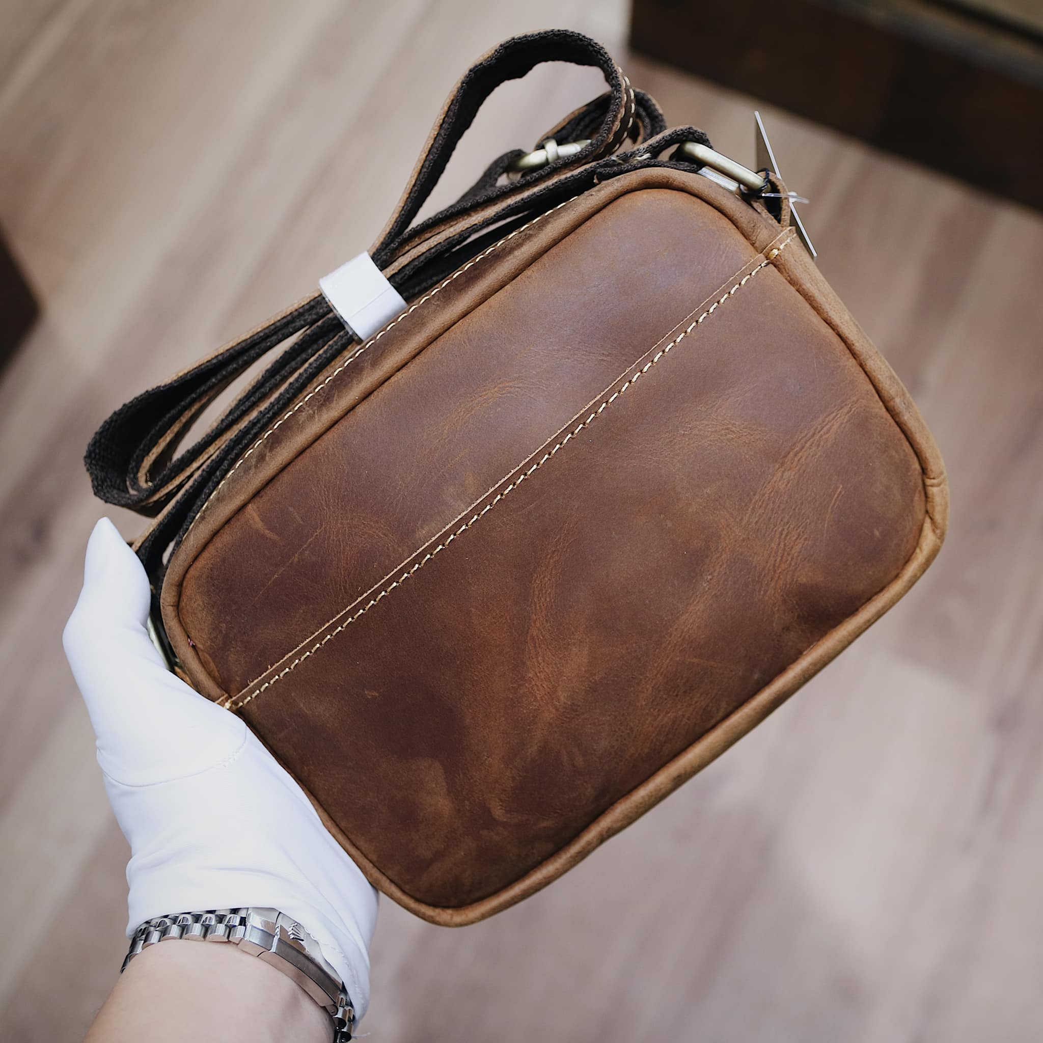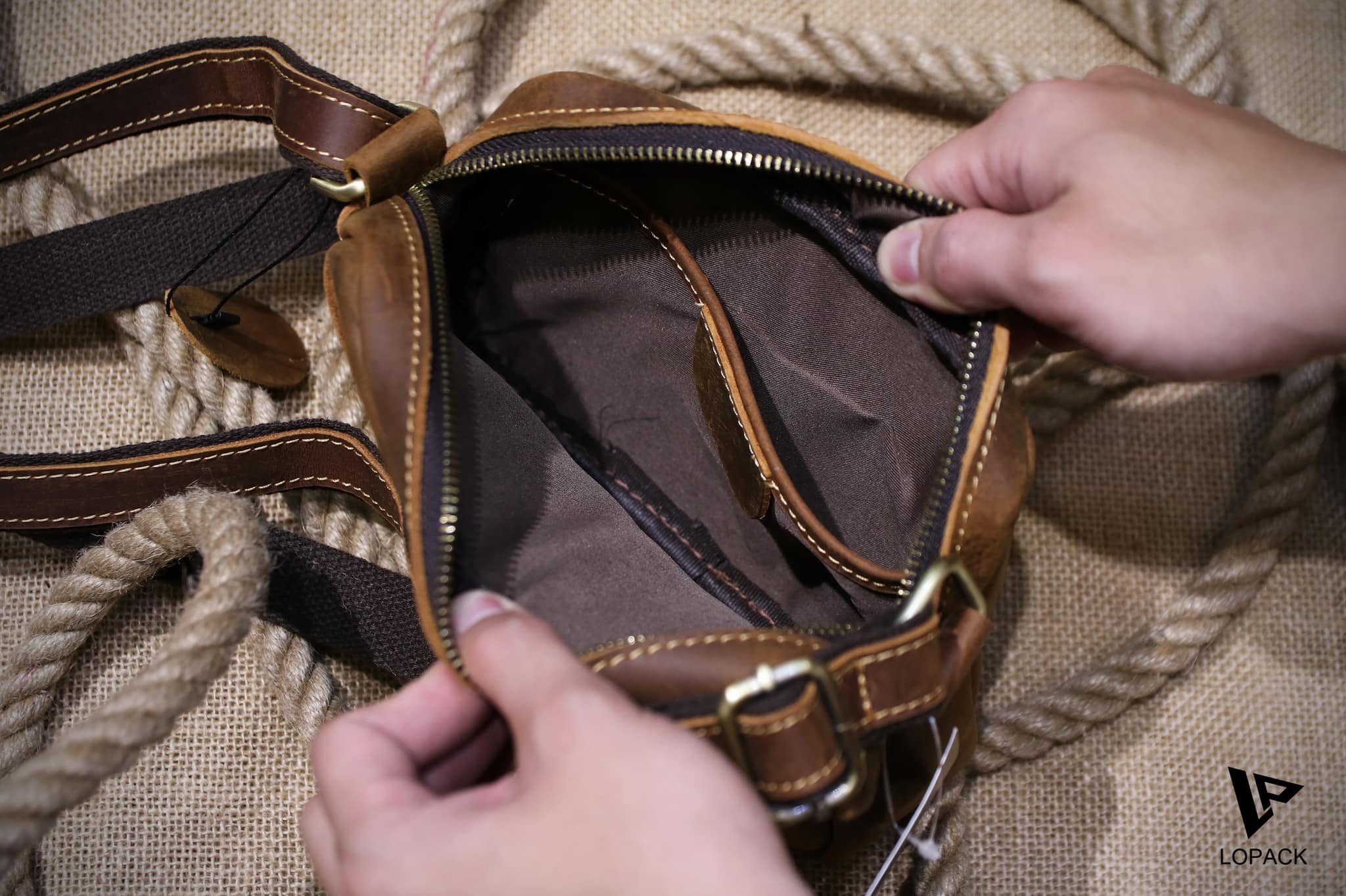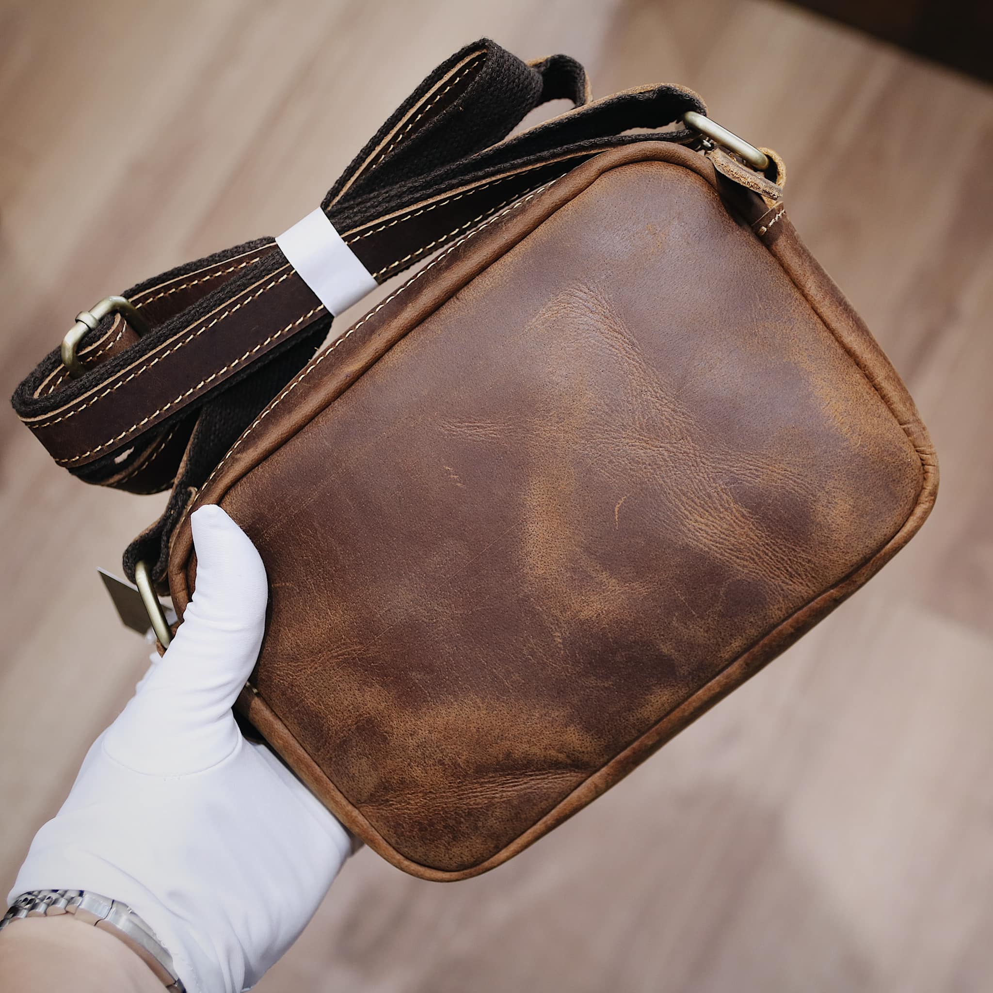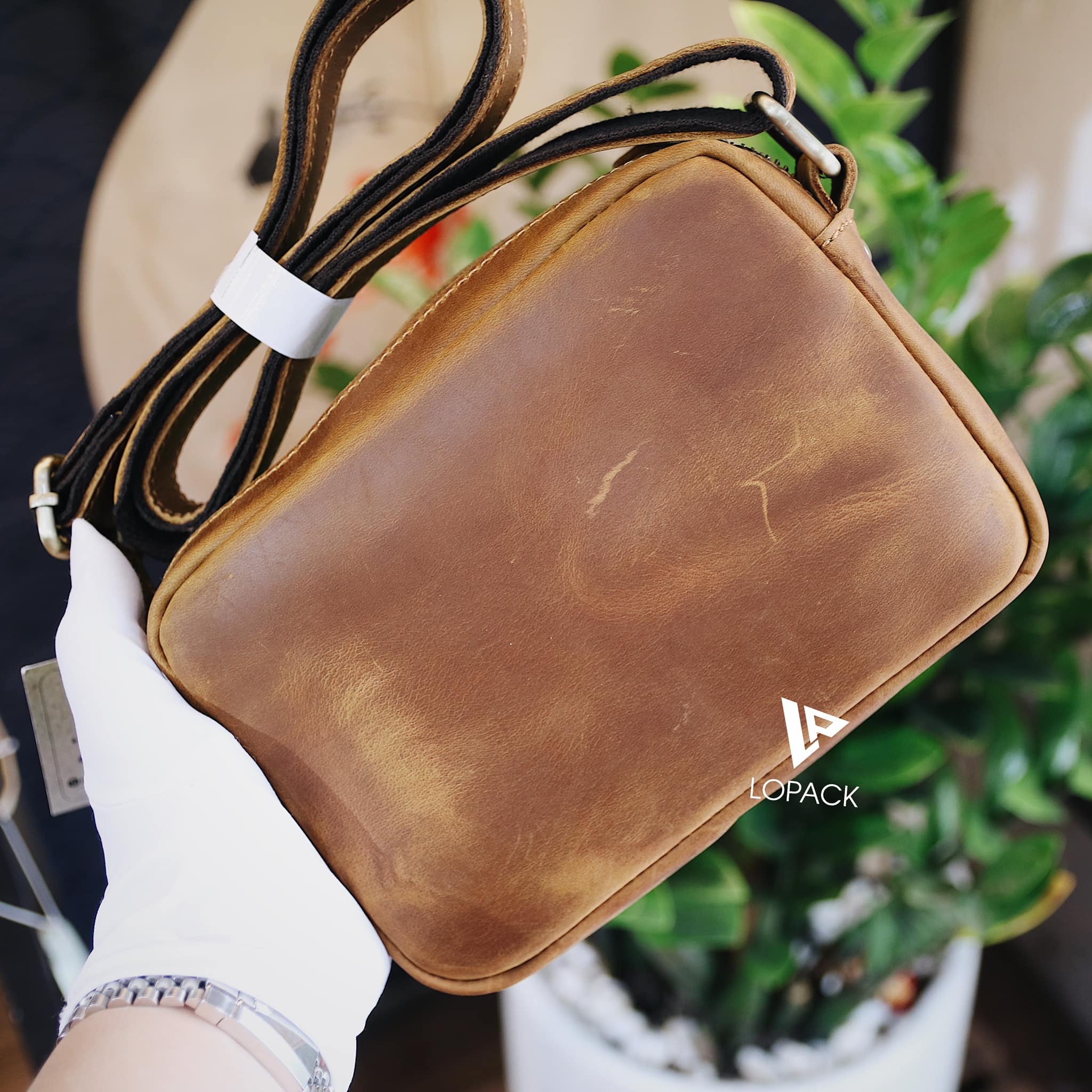 - Chất da nguyên miếng với màu nâu bò nổi bật, phong cách bụi bặm.