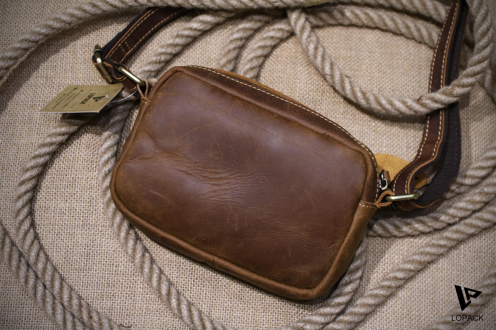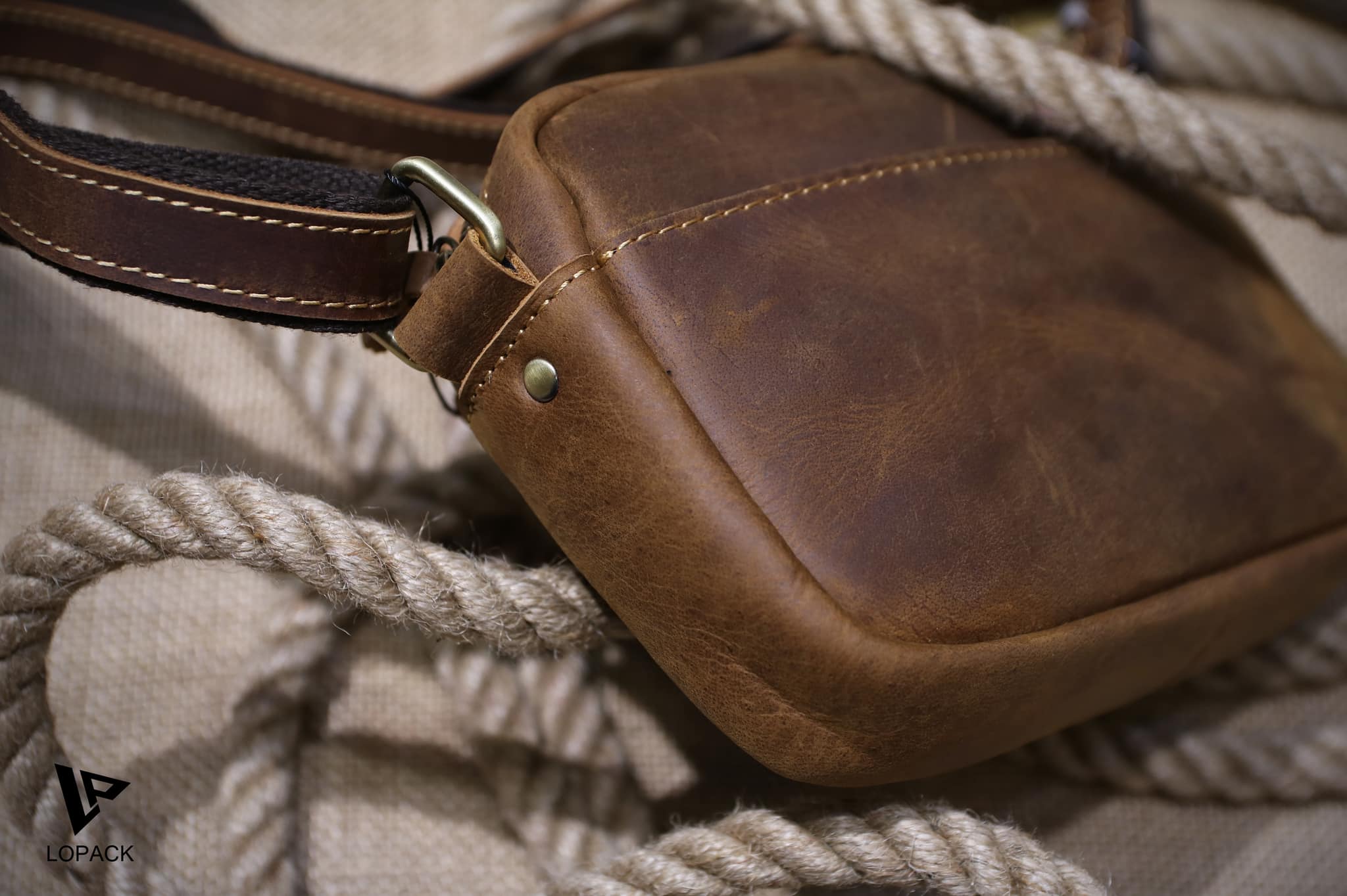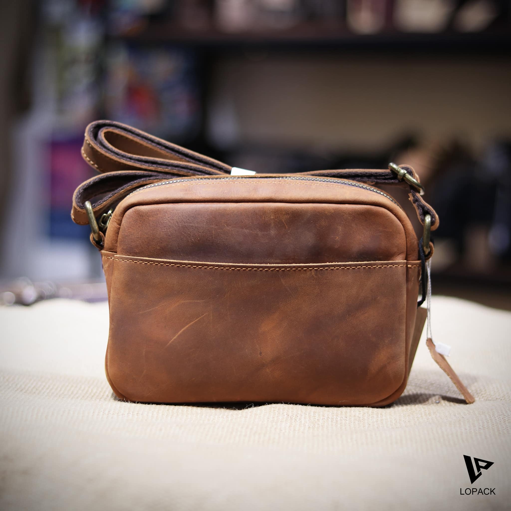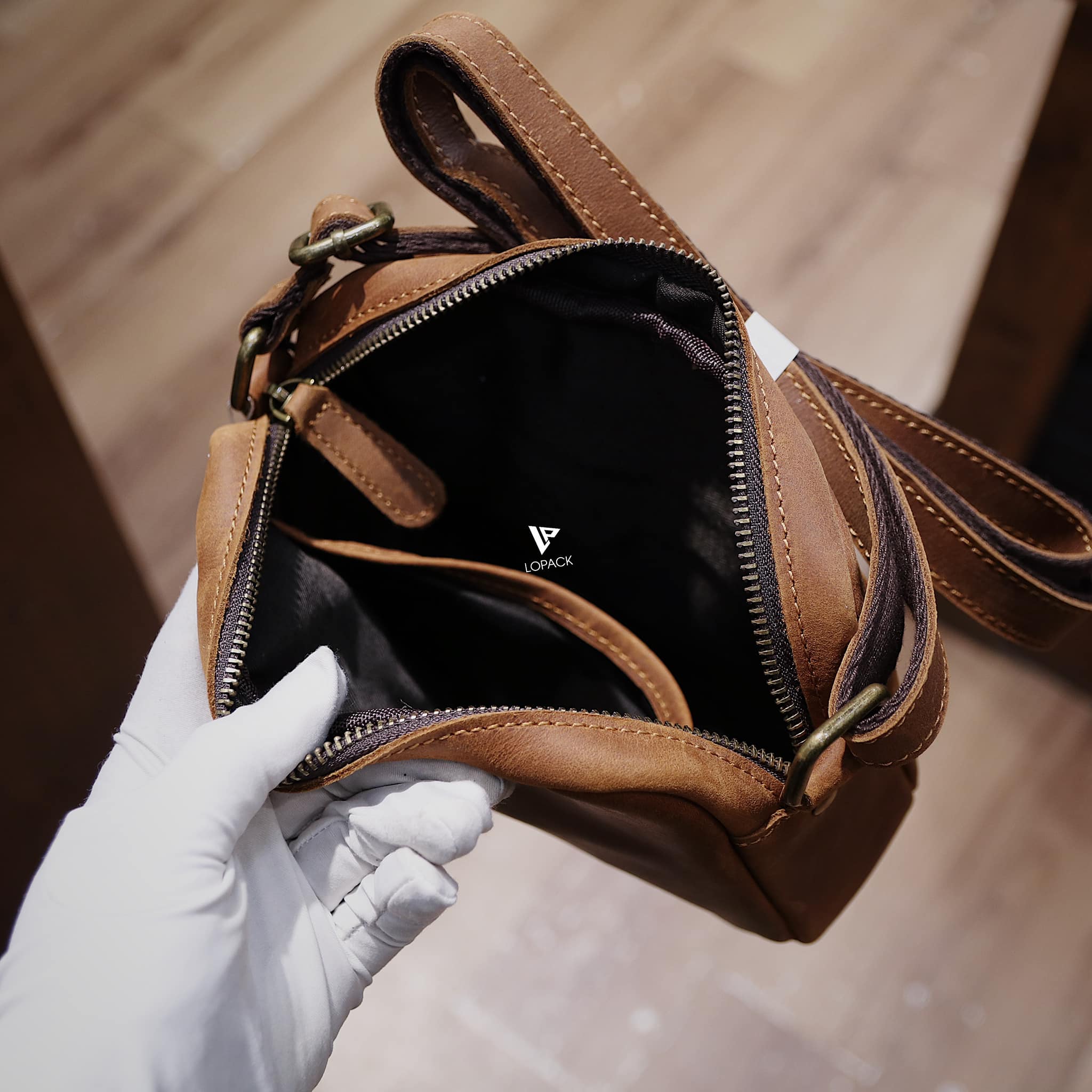 - Chất da nguyên miếng với màu nâu bò nổi bật, phong cách bụi bặm.