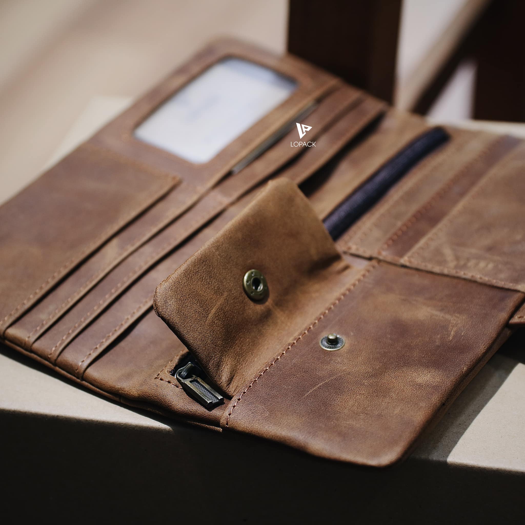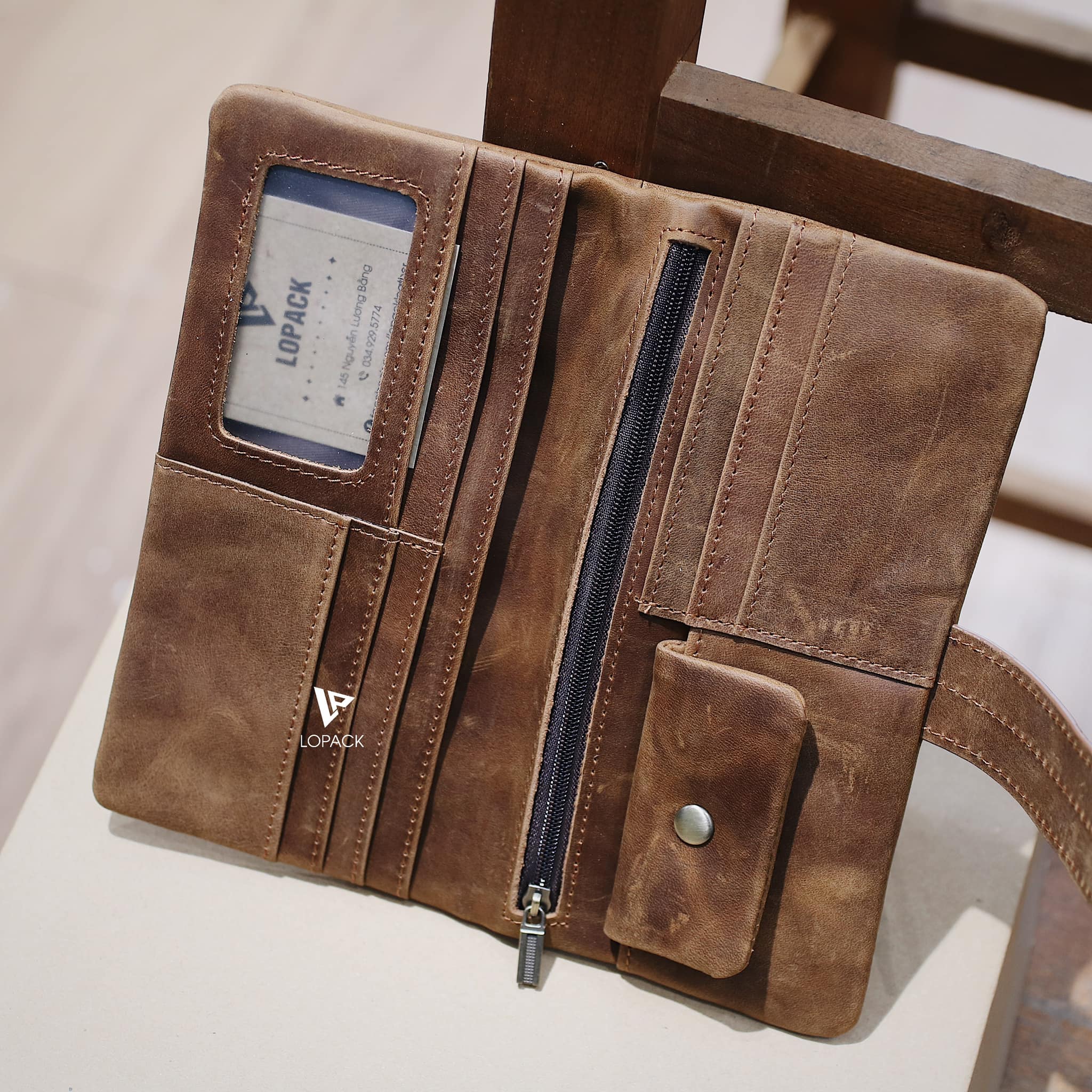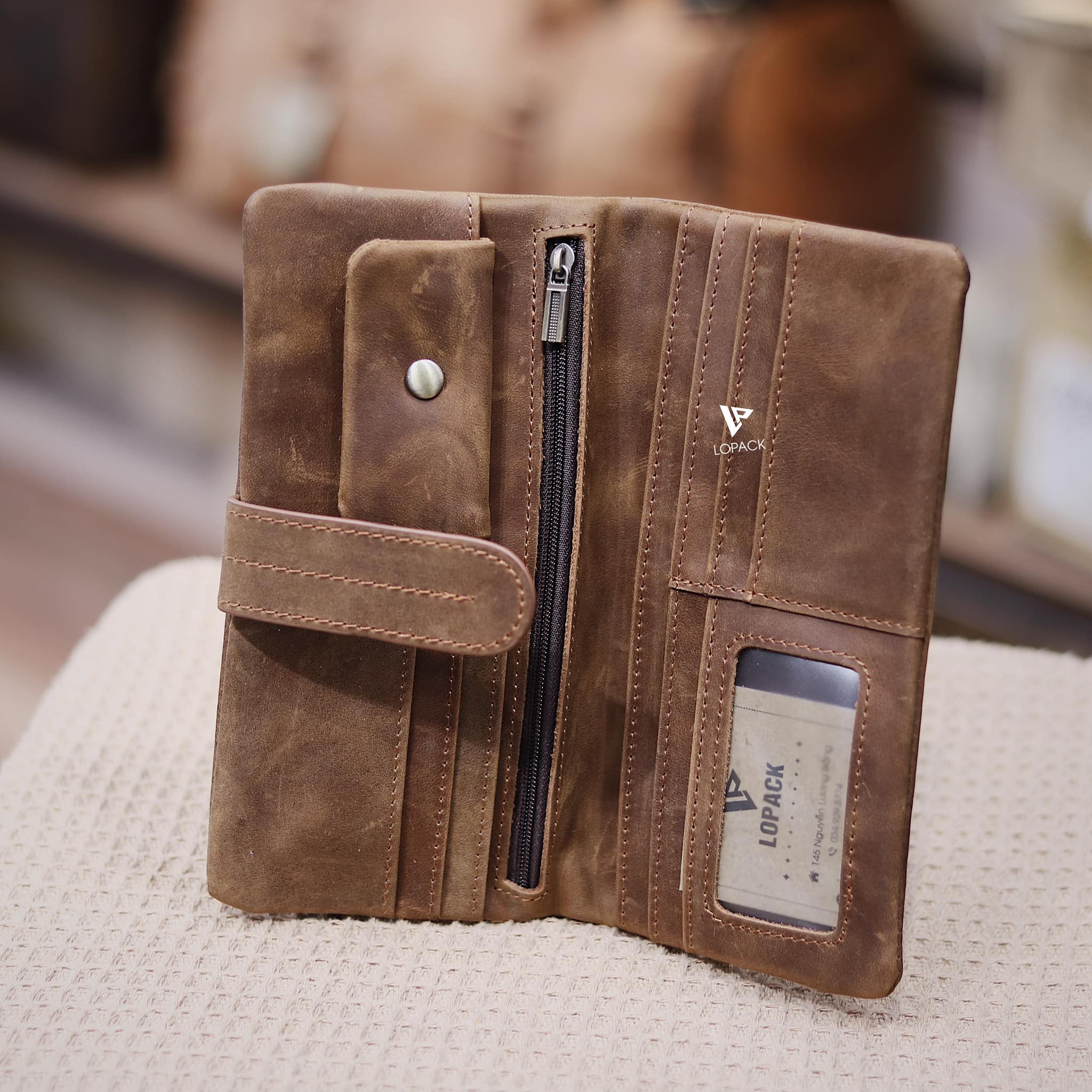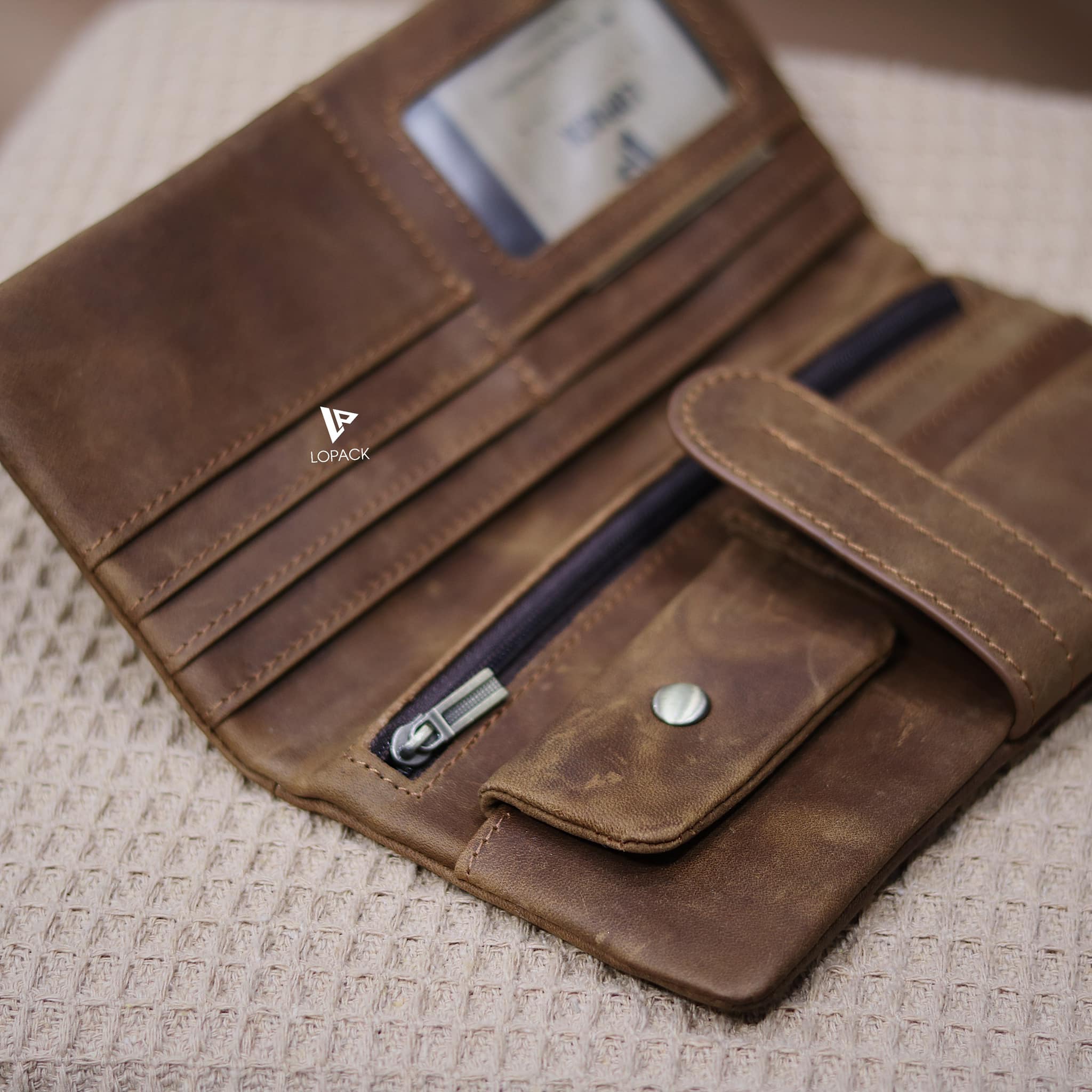 - Màu Nâu bò nổi bật, cạnh ví may ẩn vào trong, form ví mềm.