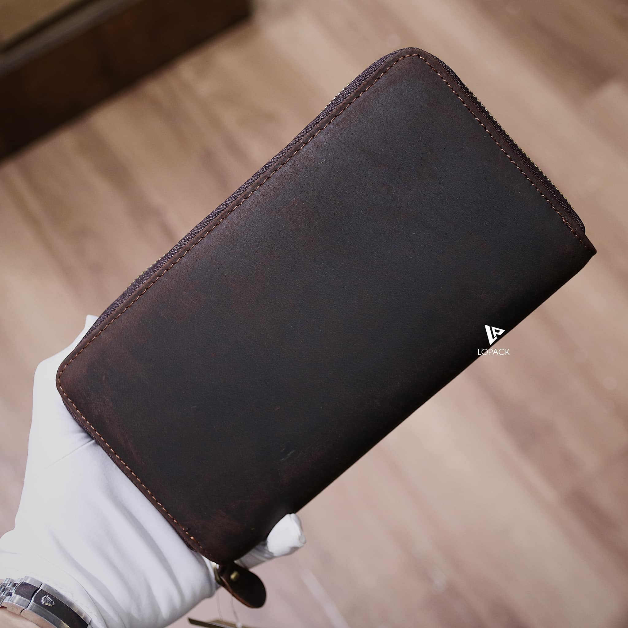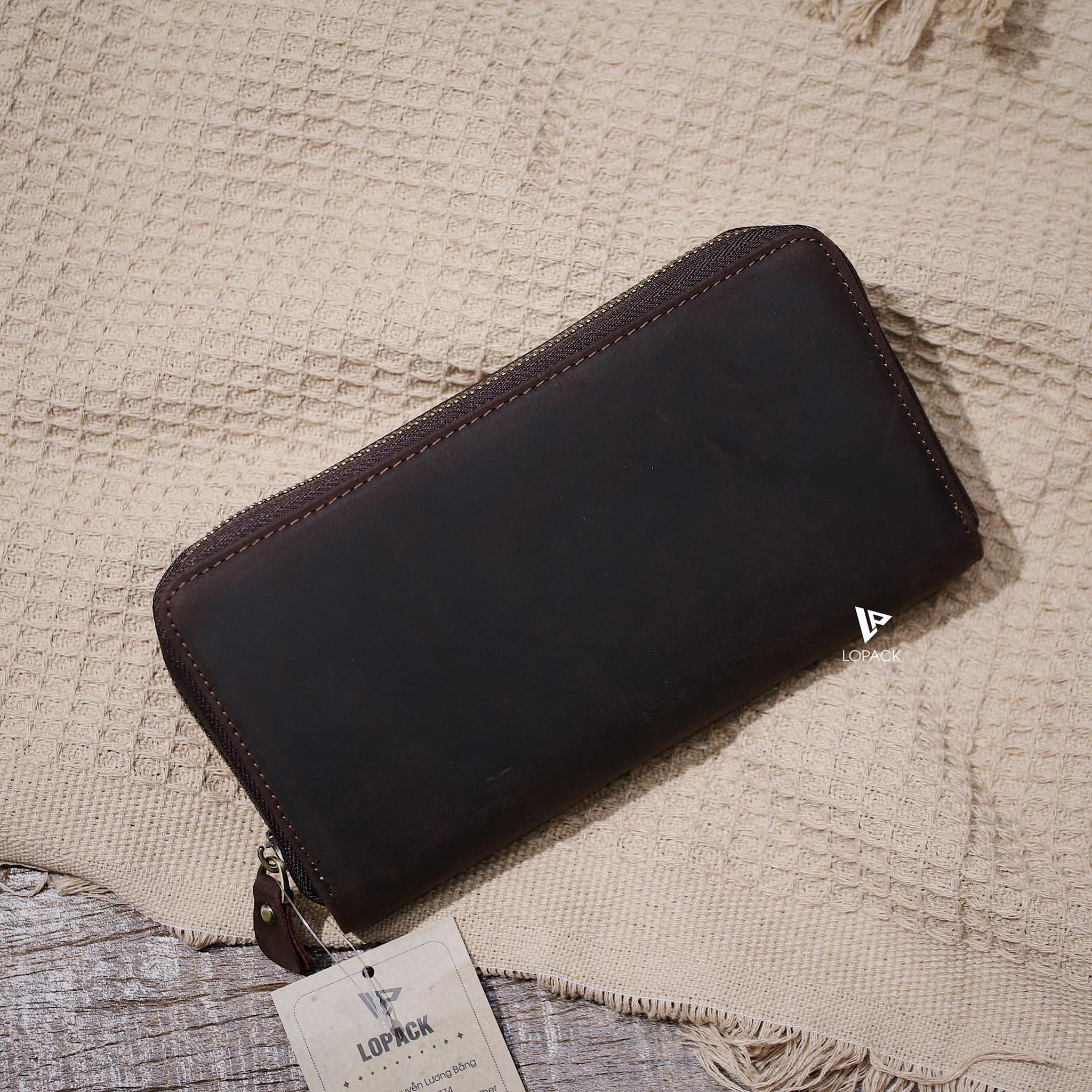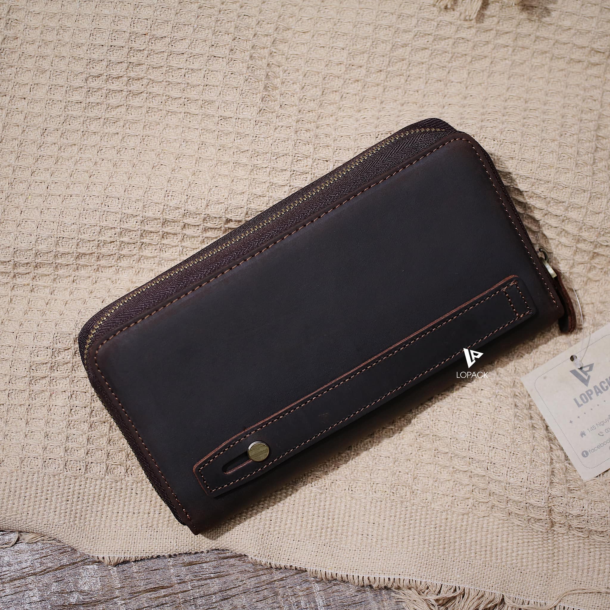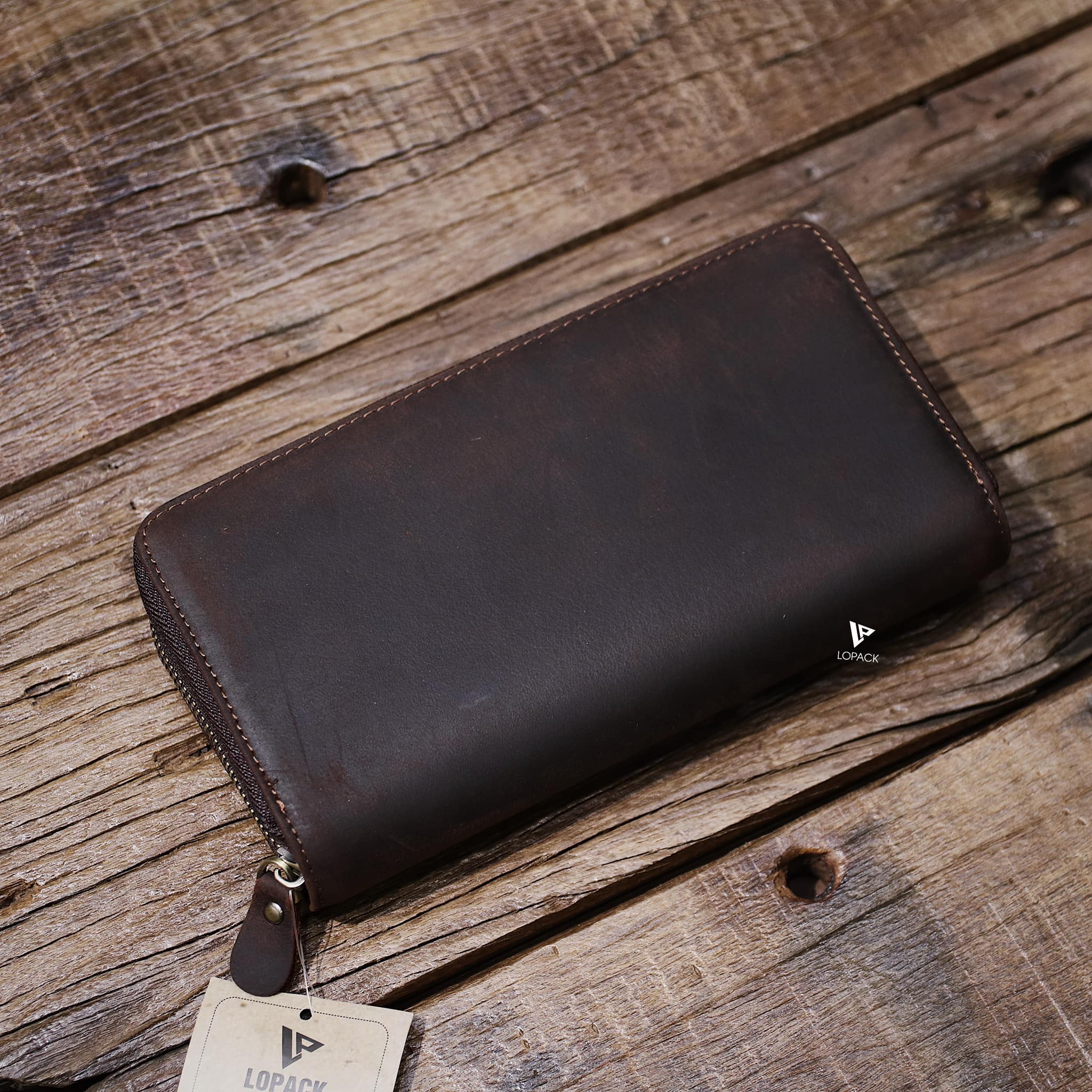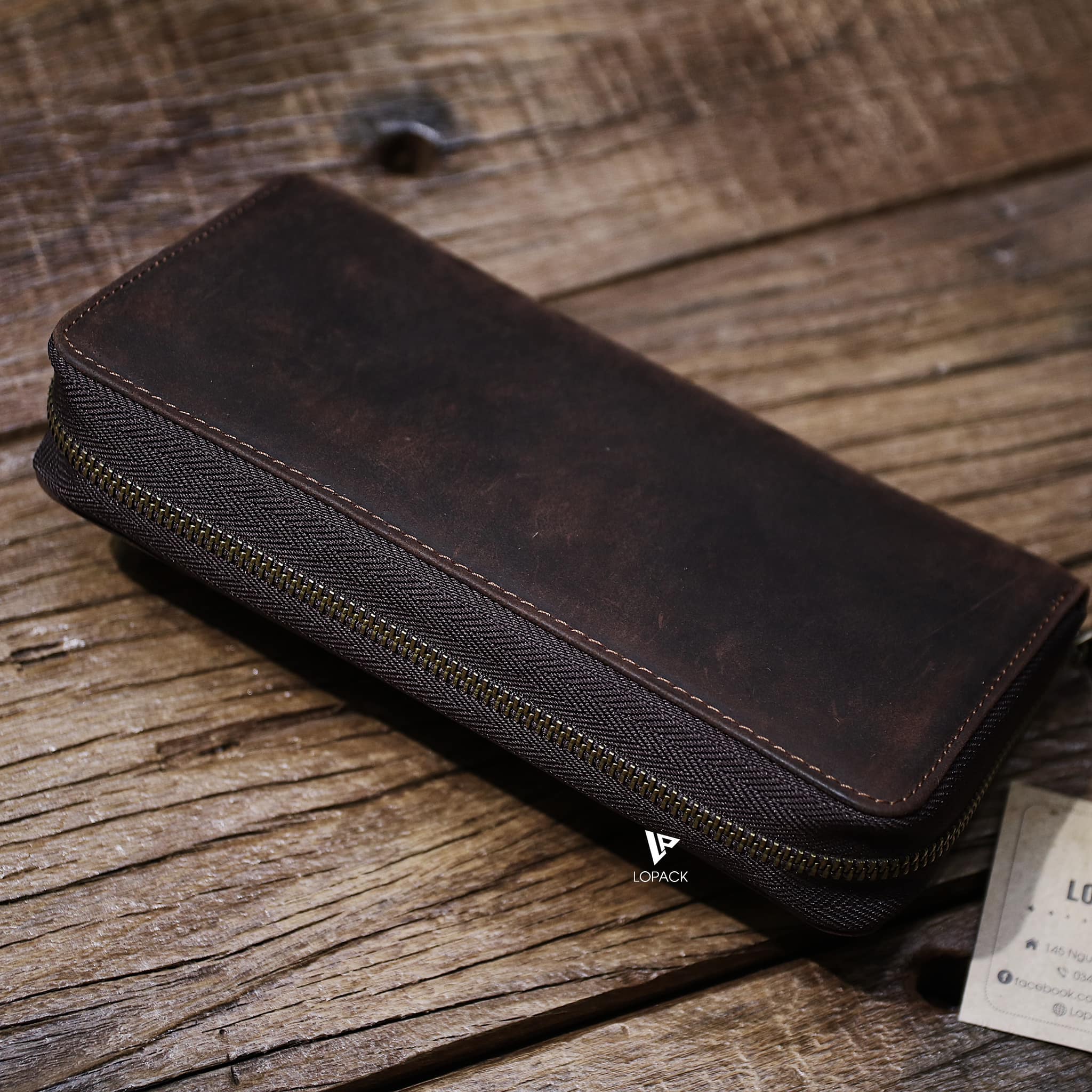 - Ví dài kéo khoá size to màu nâu, phong cách bụi bặm.
